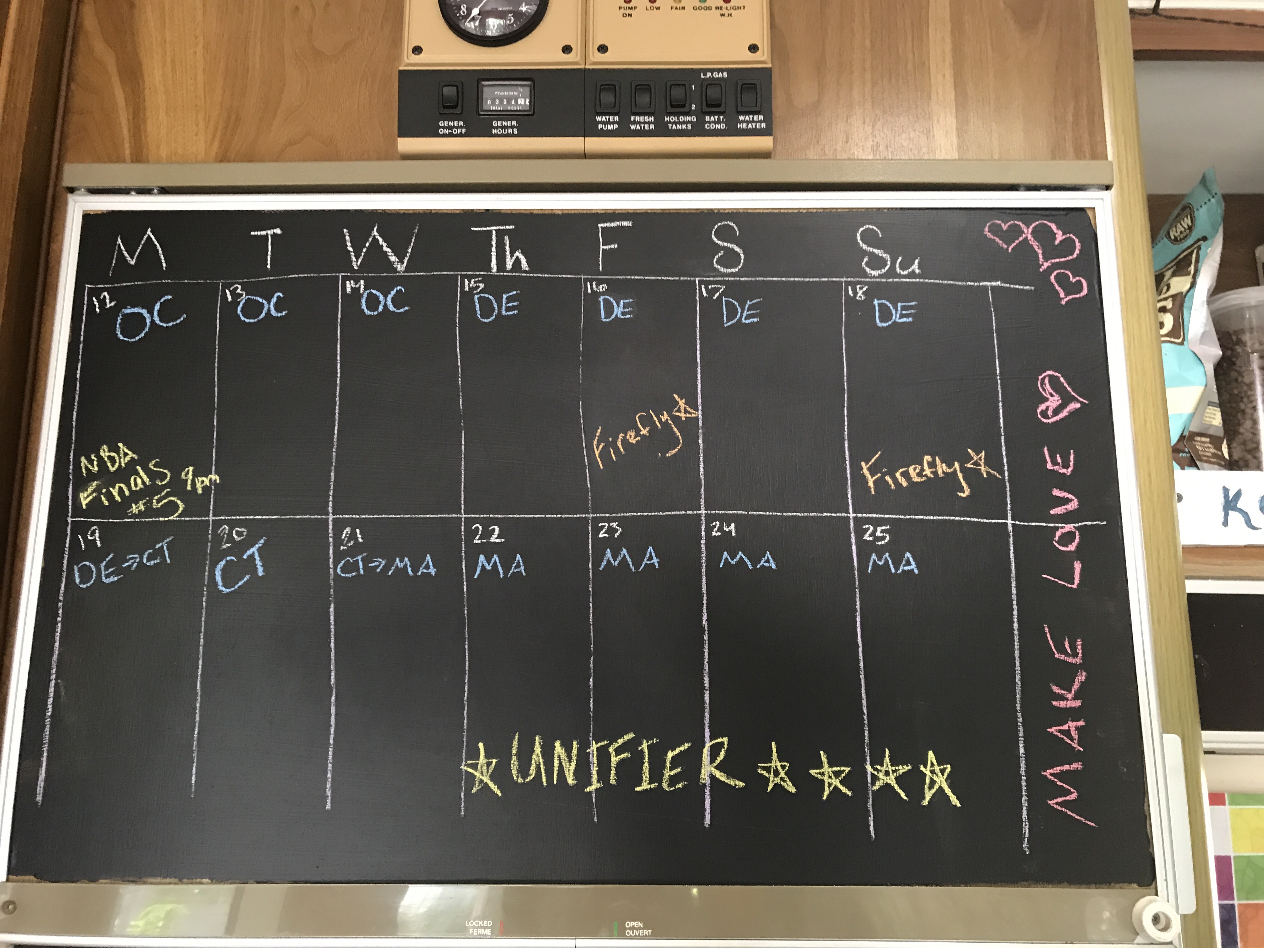 I used the freezer to create a chalk board calendar. Marking it with our location for the day and any activities we had planned. I particularly like how little is on it. Of course I also have a mental calendar that has daily tasks on it such as write blog, take care of the cats, and planning food and water for the day.❤️
