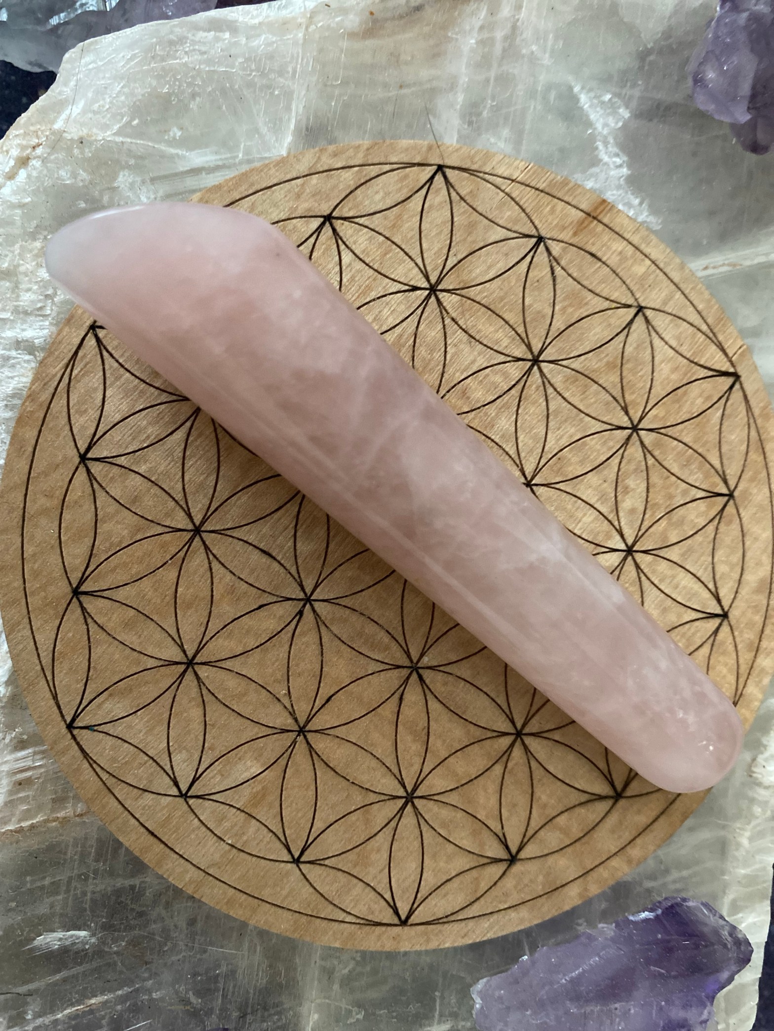 Consistent use of crystal wands and yoni eggs can help relieve pelvic floor tension which is said to effect roughly one quarter of the population of women. For this purpose I recommend starting with smaller tools and working your way up in size.