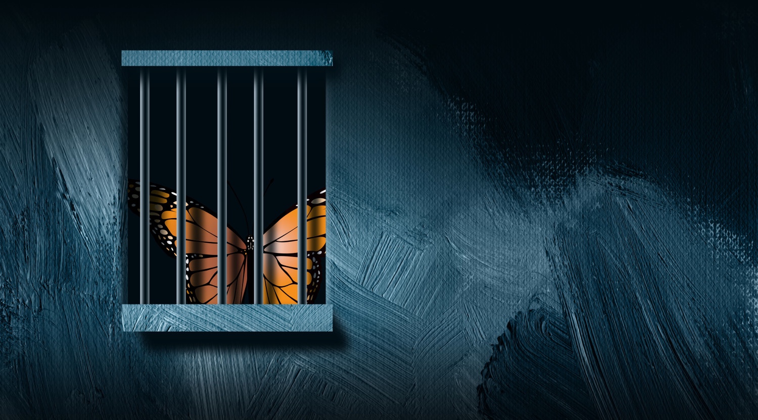 Graphic illustration of iconic butterfly peering out from behind a prison bar window. Art includes paint brush strokes. Simple, dramatic art for variety of concepts including justice, loneliness, and loss of freedom.